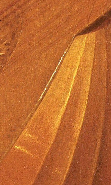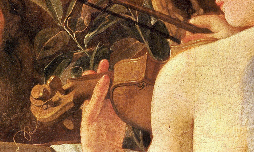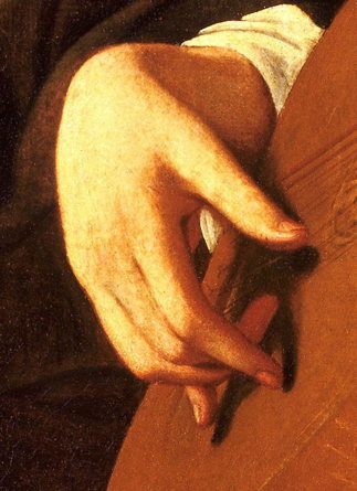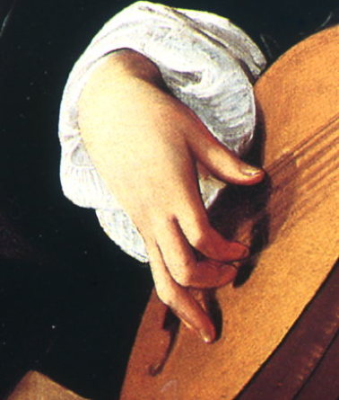 here indeed there is no edging at all (which was perfectly normal for 16th. Century lutes) but look at the beautifully observed worn and shiny edge to the wood of the soundboard, even the grain structure of the wood is clear. Any player of the lute would recognise that appearance, and it confirms Caravaggio as a master of close attention to the texture and structure of things. Even in a picture such as the Musicians the looser brush strokes and freer technique do not conceal the essential clarity of his gaze; where details are suggested they clearly represent actual structures rather than generalised approximations.