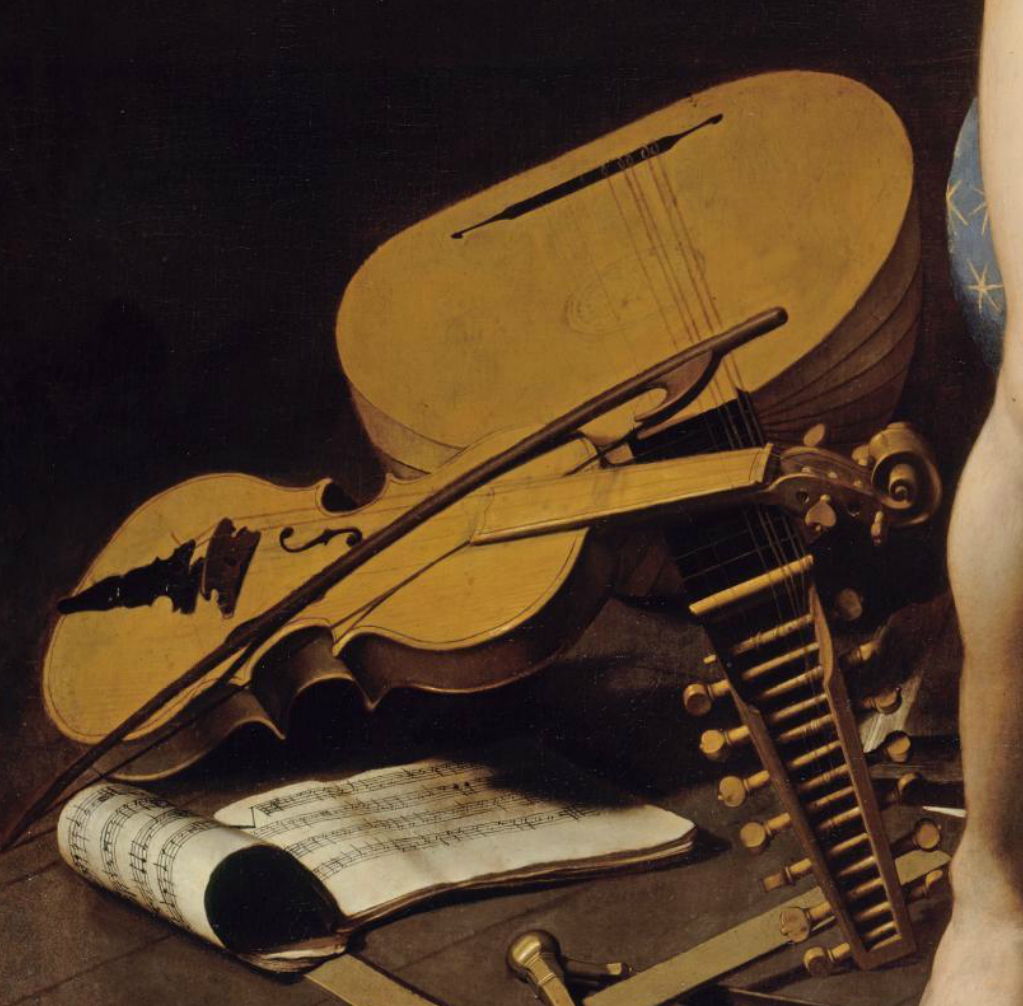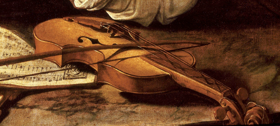 this appears to be a compilation, taking features from each of the four violins shown in other Caravaggio paintings. The little inlaid or painted decorations on the corners come from the Rest on the Flight into Egypt
