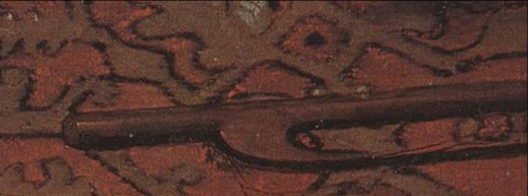 Alerted by this anomaly, one looks more closely at the bridge, for after all maybe this is just the sort of revelation that changes our ideas about 16th. Century lute construction. But no, looked at closely, the whole treatment of this new bridge betrays complete uncertainty about what the actual nature of the structure is. The exhibition, perhaps inadvertently, may have led people to overlook this particular detail because the Sixtus Rauchwolff lute, which was displayed as an example of a typical renaissance lute, has a replacement 19th Century guitar bridge, of which the outer part does indeed curl backwards, somewhat in the manner of the painting